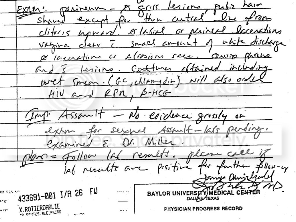 I'm well aware Baylor didn't do a full rape exam. Typically suspected rape victims were sent to Parkland. But there is this...