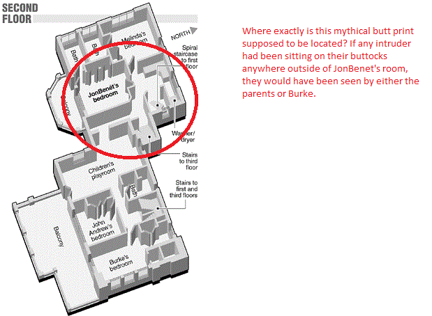 Exactly where is this mythical butt print located? Because anyone going upstairs or moving around upstairs would see an intruder sitting on the ground. Wait! Maybe they had Harry Potters magical cloak on to shield them from being seen. :thinking: