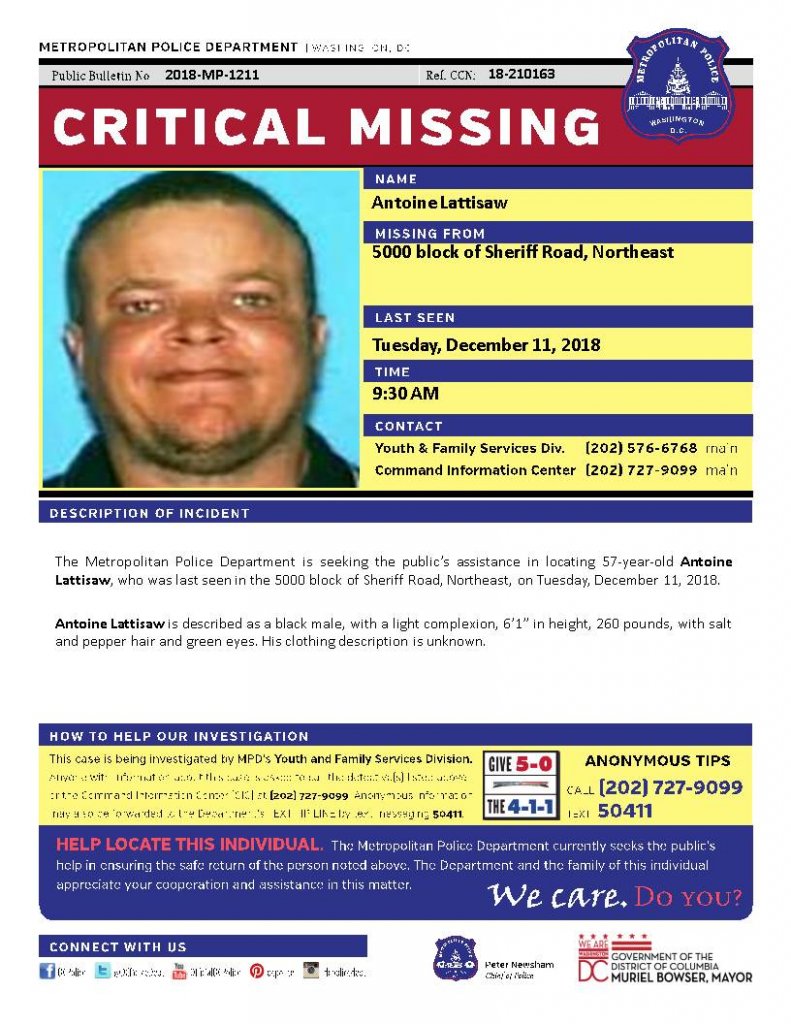 The Metropolitan Police Department is seeking the public’s assistance in locating 57-year-old Antoine Lattisaw, who was last seen in the 5000 block of Sheriff Road, Northeast, on Tuesday, December 11, 2018.
