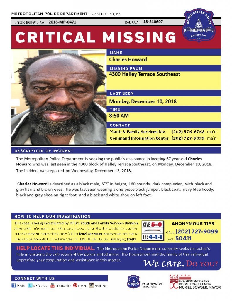 The Metropolitan Police Department is seeking the public’s assistance in locating 67 year-old Charles Howard who was last seen in the 4300 block of Halley Terrace Southeast, on Monday, December 10, 2018.