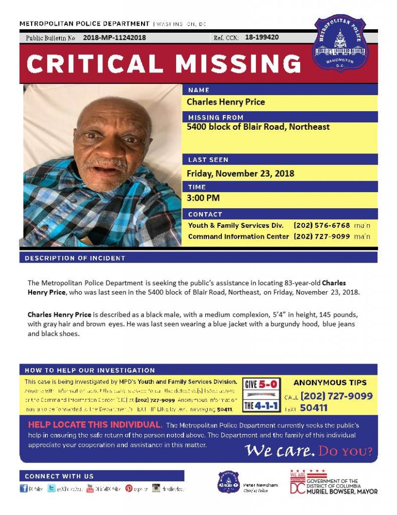Critical #MissingPerson Charles Henry Price, 83, who was last seen in the 5400 block of Blair Road, Northeast, on Friday, November 23, 2018. Seen him? Call 202-727-9099/text 50411