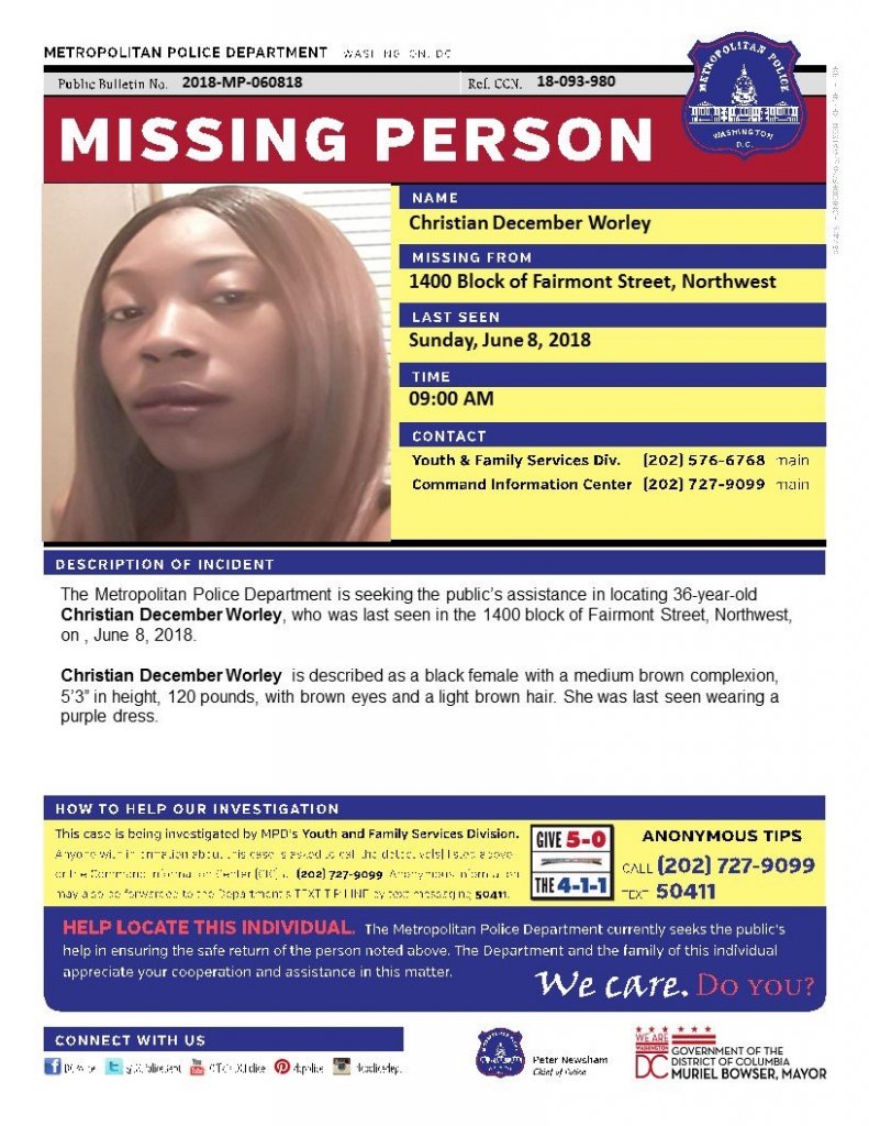 #MissingPerson Christian December Worley, 36, who was last seen in the 1400 block of Fairmont Street, Northwest, on Friday, June 8, 2018. Seen her? Call 202-727-9099/text 50411
