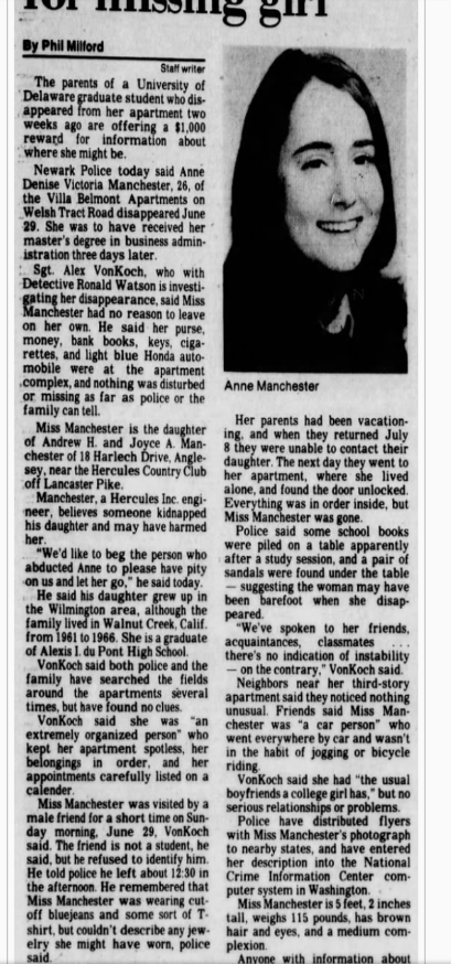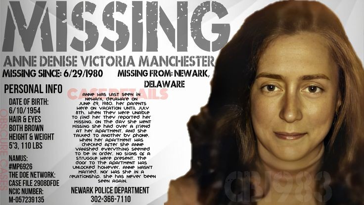 Manchester was last seen at home at Villa Belmont Apartments in Newark, Delaware on June 29, 1980. She has never been heard from again.
