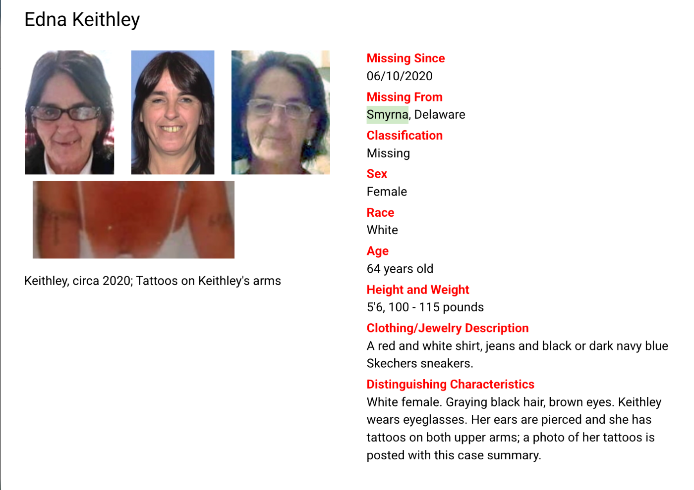 From charley project: Keithley was last seen walking away from her residence towards the Smyrna, Delaware town limits on June 10, 2020. She has never been heard from again. She was not reported missing until June 19. Few details are available in her case.