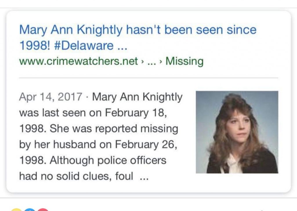Mary Ann Knightly was last seen alive in the company of her husband at their Bear home at 1517 DuPont Highway on February 18th 1998.