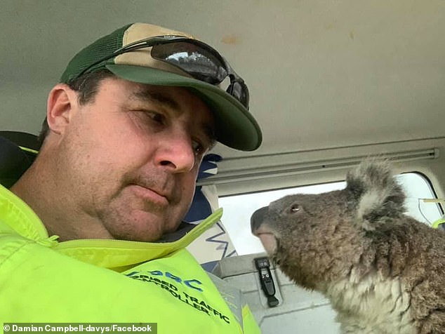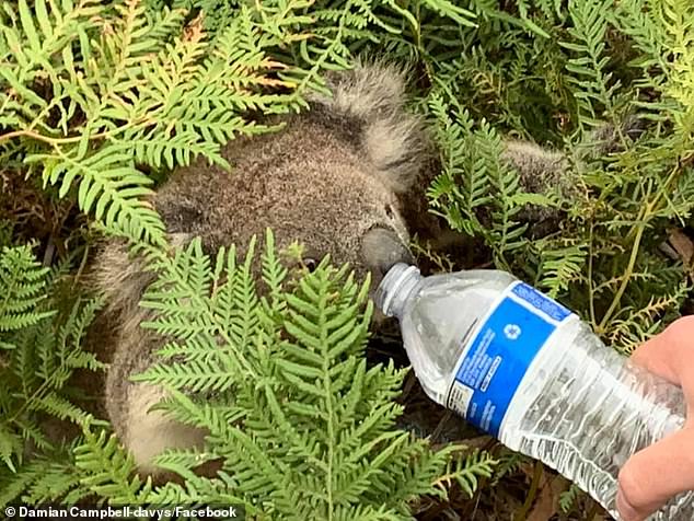 Desperate for shelter, the dehydrated koala climbed inside the truck and was offered a drink from Mr Campbell-Davys' water bottle.