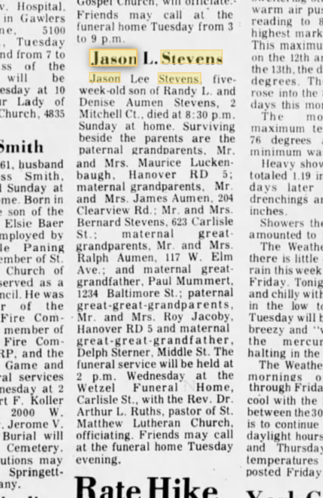 I am not sure about the year, but I believe his name was Jason Stevens and he was born before 1981. For some reason, I thought I had found something years ago with a “unique” spelling like Jayson(or similar) in an obituary that I can no longer find. That obituary was for Maurice “Sonny” Luckenbaugh.
