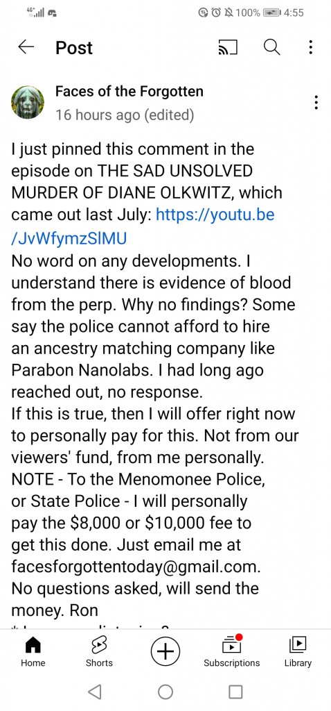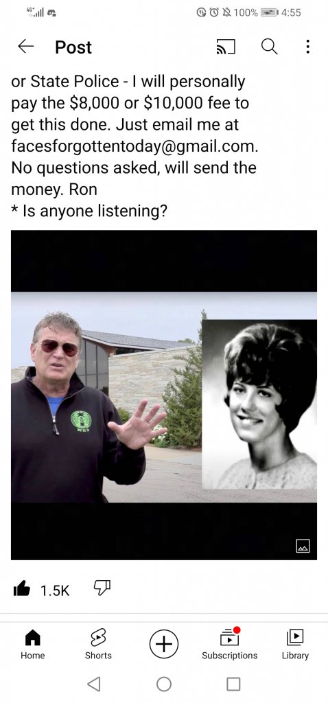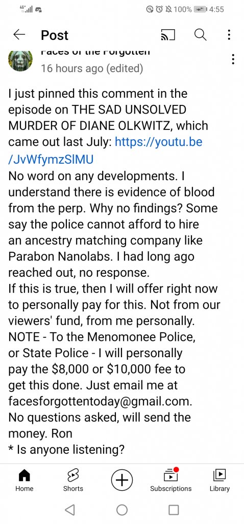 I don't know if this is the right place to post this but nobody has commented on that thread since 2020, I'm looking for someone who can contact the LE in Menonomee who can then contact Ron and arrange for the (free to LE) DNA test to be done. Forgive me if this is the wrong place.