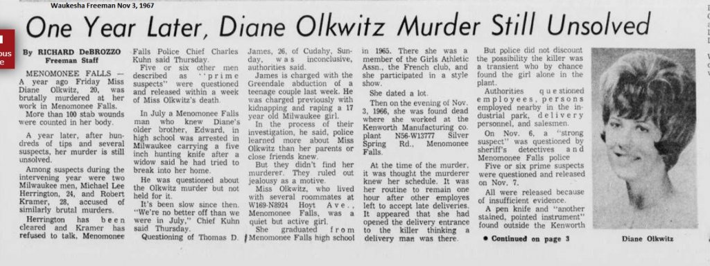 The above suspect mentioned above by waunakeegan also lived in the Menomonee Falls area as late as 1964 and would have been in his mid-teens before moving to Milwaukee and age 18 when Diane died. Both victims died of stab wounds.