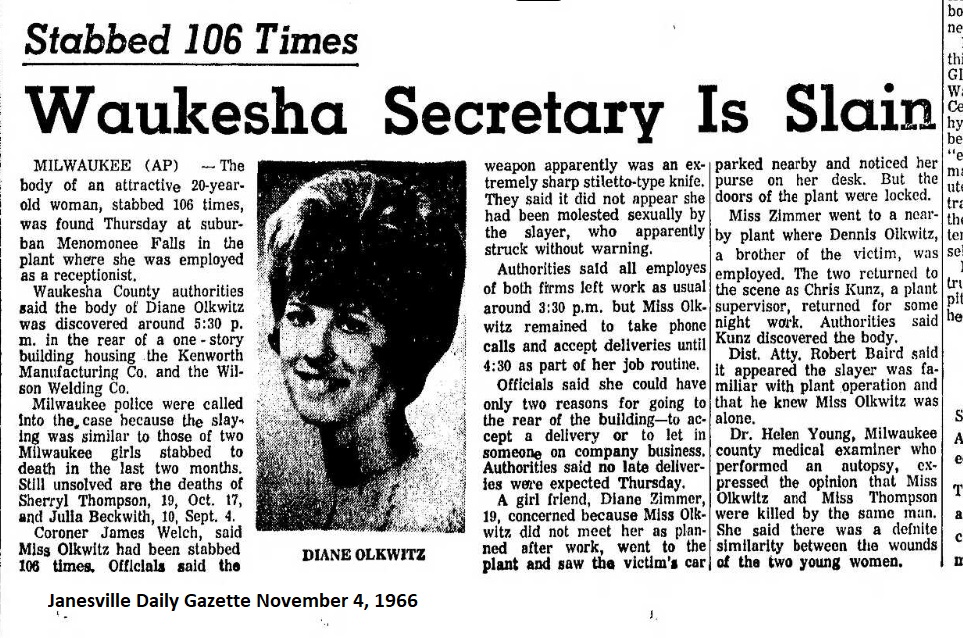 A Janesville Daily Gazette article from Nov 4, 1966, stated, "Dr. Helen Young, Milwaukee Medical Examiner who performed an autopsy, expressed the opinion that Miss Olkwitz and Miss Thompson were killed by the same man. She said there was a definite similarity between the wounds of the two young women."