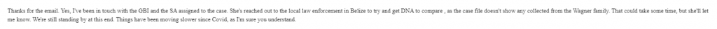 “Thanks for the email. Yes I’ve been in touch with the GBI and SA assigned to the case. She’s reached out to law enforcement in Belize to try and get DNA to compare, as the case file doesn’t show any collected from the Wagner family. This could take some time but she’ll let me know. We’re standing by at this end. Things have been moving slower with Covid, as I’m sure you understand. “