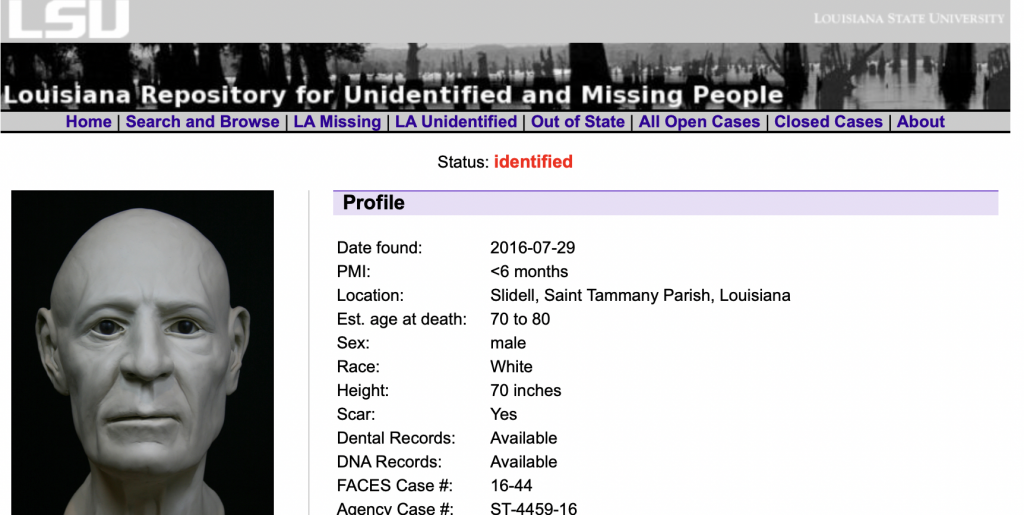 I’m not seeing where they’re marked as identified but that’s still fantastic news. That seemed like an extremely difficult caseSt Tammany Parish John Doe’s Namus was removed and marked as identified.