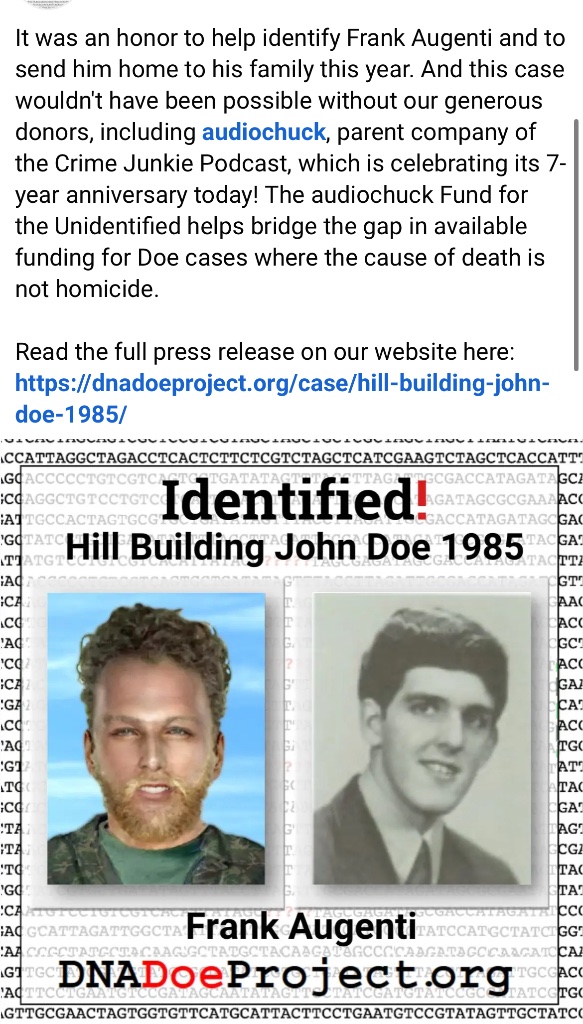 Further research into Frank Augenti revealed that he had dropped off the radar in the 1980s, and the team on this case found further evidence to suggest that he could be Hill Building John Doe. His name was presented to the medical examiner’s office and, in August 2024, this identification was confirmed.