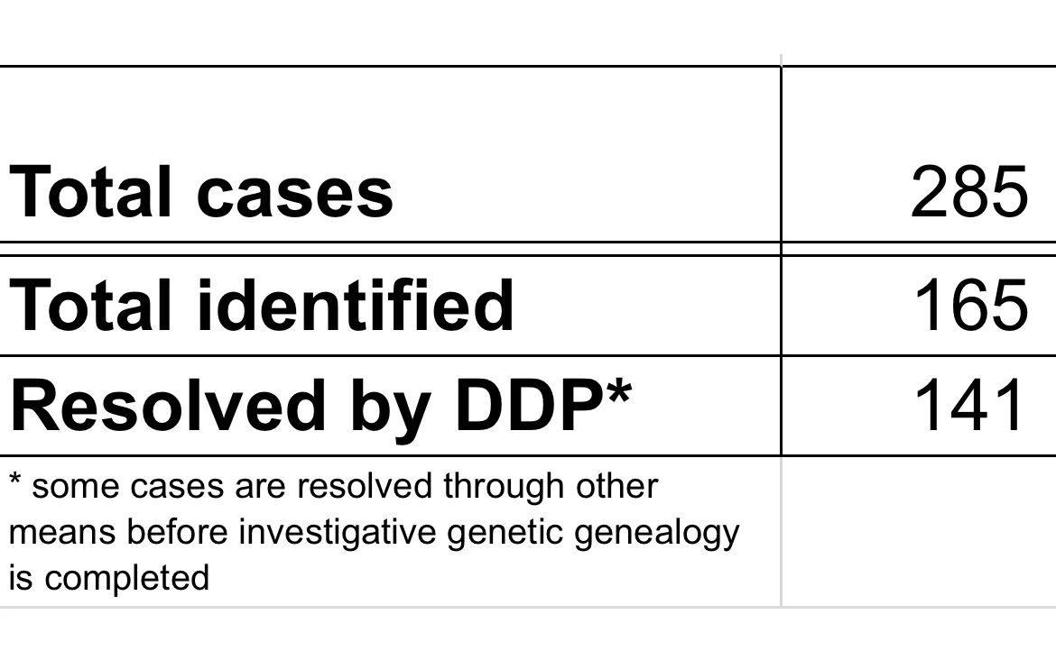 According to the DDP solved page, 130 Does have been publicly announced as identified, with 116 of those solved by the DDP. Based on the most recent update to the DDP Dashboard, the total number of Does identified by the DDP is 141, with around 25 cases still awaiting public announcement.