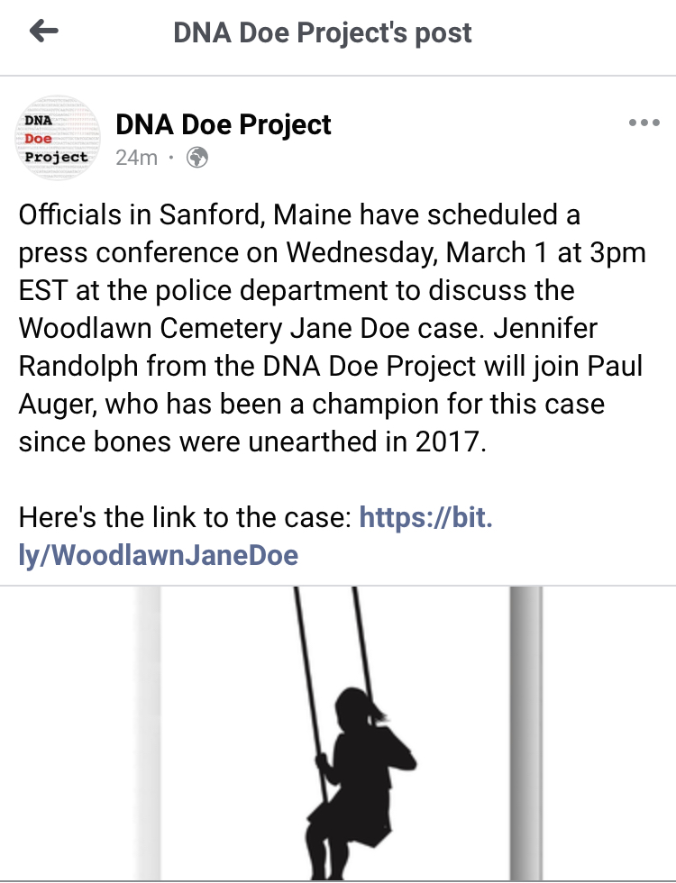 It looks like Woodlawn Cemetery Jane Doe could have been identified, the press conference is scheduled for March 1 at 3 pm EST