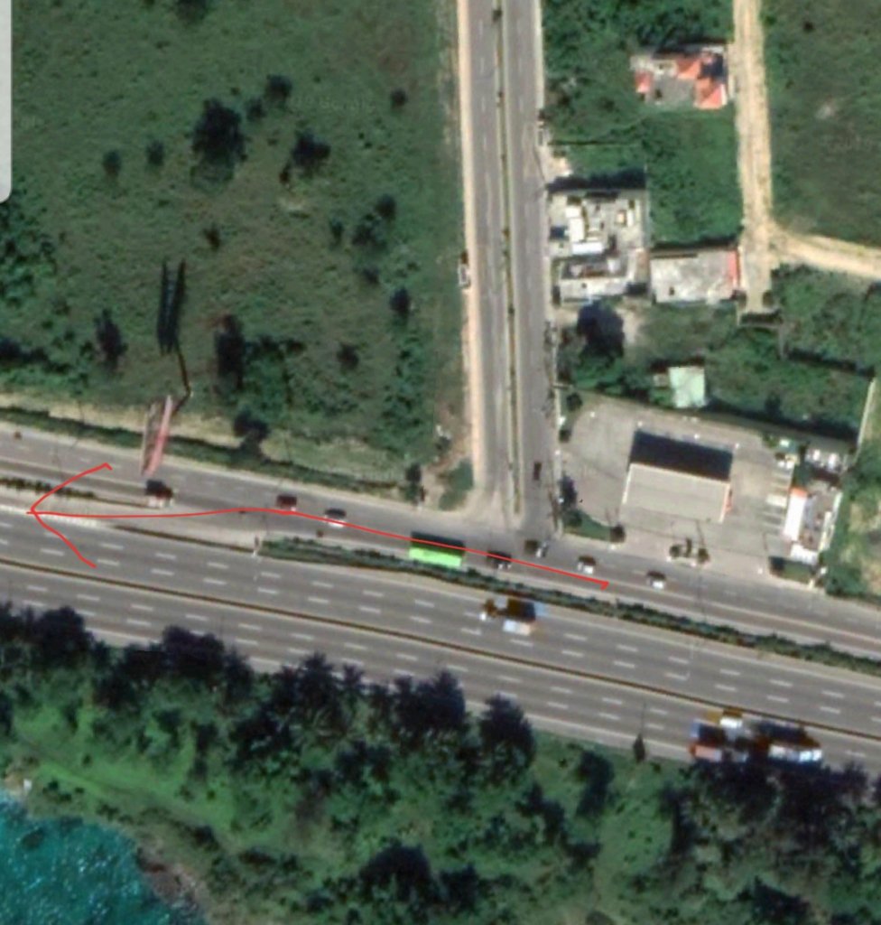 The problem with both of these proposed turn around spots is that when turning west off of Hwy 7, it looks like you enter a small road (Marginal Avenida Las Américas) running parallel to the main interstate-like road (Autopista Las Américas). It is unclear from the Google satellite image whether there is an actual barrier between this side road and the west-bound lane of the "Autopista." I don't see obvious tire tracks between them either, unlike the multiple tracks seen in the dirt median between the main east and west bound lanes at this spot. So if they went west on the "Marginal" road, it looks like the first opportunity to enter the main road was in the area indicated in my map above, and in detail here: