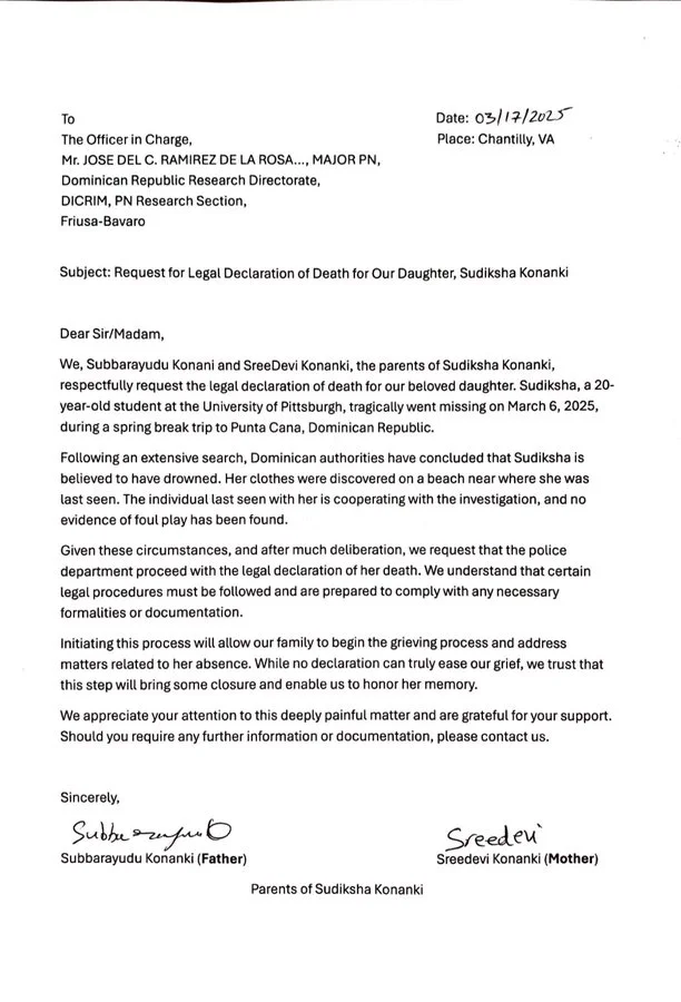 The letter the parents of Sudiksha Konanki have filed with Dominican Republic authorities asking for officials to declare their daughter legally dead. They say Joshua Riibe is cooperating with authorities, although he is not officially named. There is no evidence of foul play.