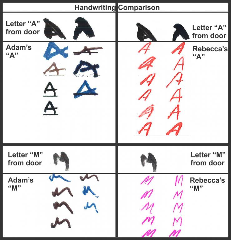 The hand writing analysis - Rebecca’s writing tilts to the right. Adam’s is tilting to the left. At least in the letters shown above. I went back to took at the entire message left on the door. Wow.