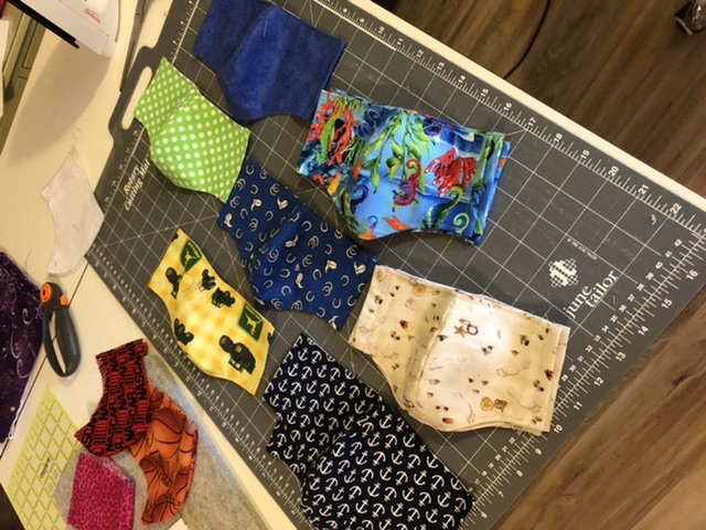 8 mask bodies finished today. Now they need something threaded thru the channels. I have some elastic but probably not enough. I took the bias tape out of one that my friend made and measured it (48”). Then, I put it on to see if it really was too long. I guess for an adult head, to tie it in a bow at the back, 48” isn’t overly long. I’m going to go thru all my leftover ribbon, trim, and strips of fabric. I may just roll a piece of fabric, use an elongated zig zag stitch and call it a day. Stay tuned.