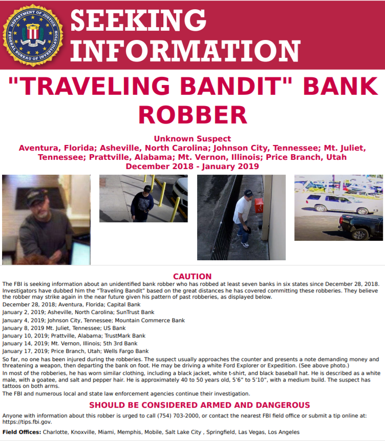 The Traveling Bandit has covered more than 3,200 miles in a string of robberies that started on Dec. 28 at a Capital Bank in Aventura, Fla., about 20 miles north of Miami. He progressed from there to holding up a bank in North Carolina, then two in Tennessee, and one each in Alabama and Illinois. His most recent one was on Thursday in Price, Utah.