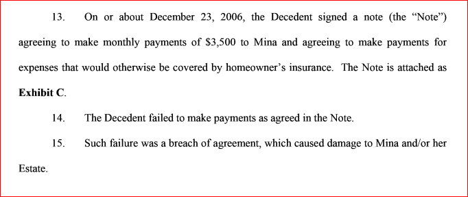 In addition, the lawsuit alleges that DS transferred jointly held funds "into an account or to multiple accounts in which neither Mina nor her Estate had/has any interest; and that DS "executed such transfers without the knowledge or consent of Mina."