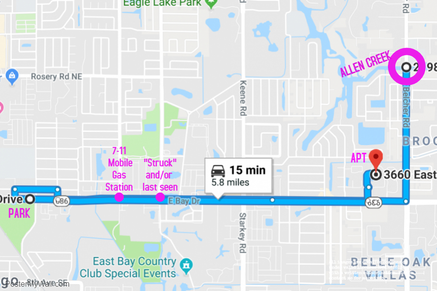 I don't think it's even 5 minutes. Now granted, I am not a mapper, lol. I usually don't share mine, but I had to see where this 7-ll/gas station is. It's the next main north/south street from Lake Ave. where mom says she was "struck" and last saw Jordan. So, a block maybe? Ignore that 15 min thing in the middle of the map - that is the distance from Allen Creek (where they were searching this morning) to the park where she woke up.