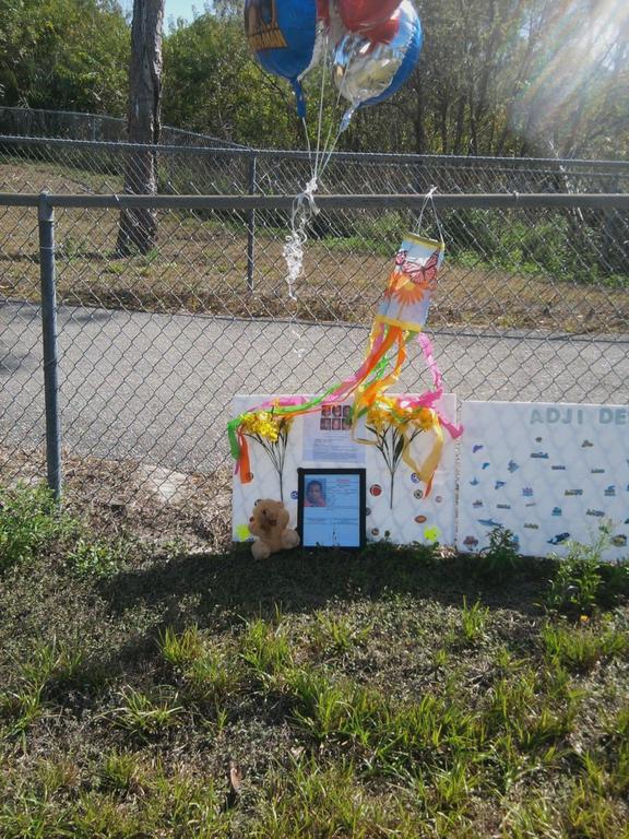 Spider-Man balloons swayed in the air and a teddy bear was left on the grass beneath a framed flier of Adji. A poster with images of the 6-year-old was propped up on the chain-link fence, yellow flowers and colorful stickers surrounding another flier pasted to the board.