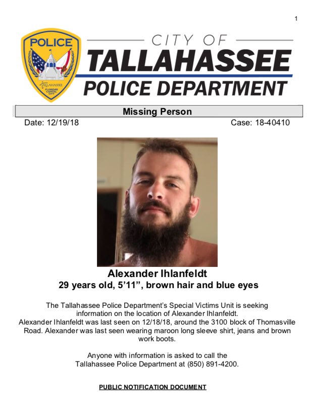 The Tallahassee Police Department’s Special Victims Unit is asking for information on the location of a missing man, 29-year-old Alexander Ihlanfeldt.