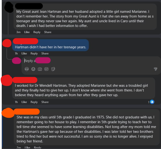 53 years shes been a jane doe. thats why i posted here, reddit, and FB hoping someone could locate a yearbook with her in it. only thing i have is her birth name and adoptive name of marianne hartman. im still sad that the family didnt report her missing. but the 70s were a different time.