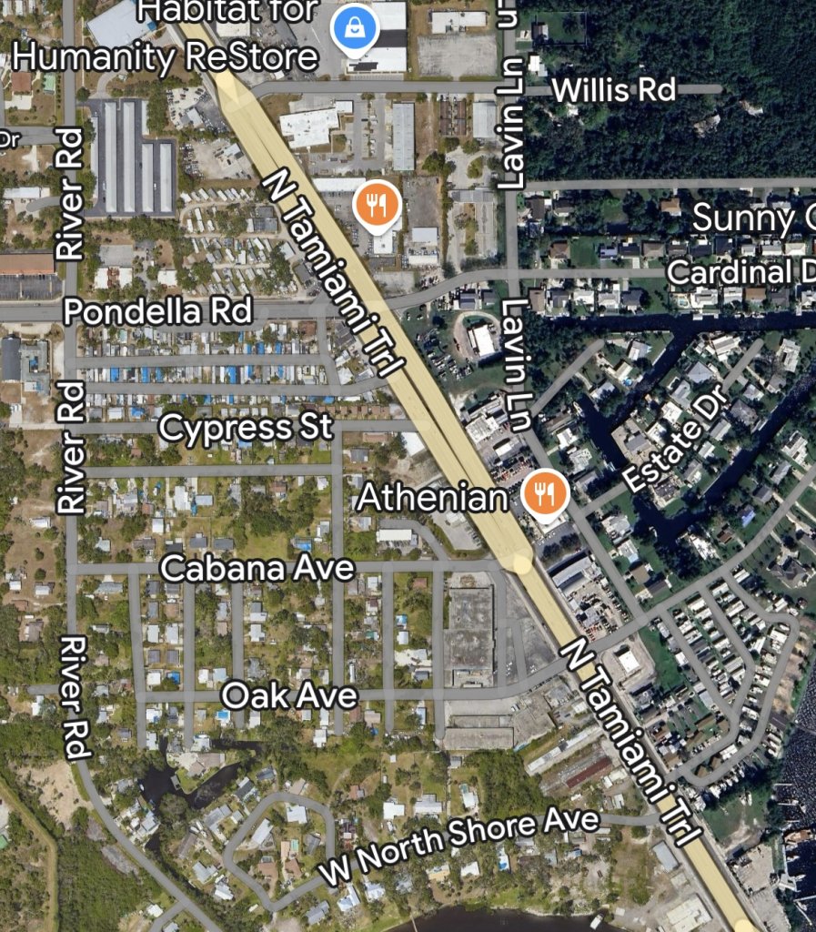 I’ve included a SS of the area she came from, the area on the other side of the bridge, and an overview of the whole thing. Tamiami and 41 are the same road.