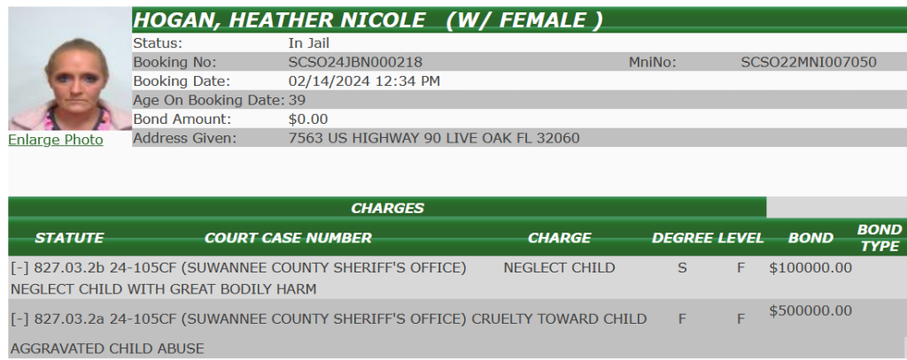 On Wednesday, Heather Hogan, 39, was arrested on the charges of aggravated child abuse and child neglect. She was booked into the Suwannee County Jail with a bond set at $600,000.