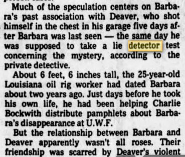 I read a newspaper article on this case. Pensacola News, December 31, 1979. Barbara's father lambasted the police for not dusting the car for fingerprints, an egregious example of police work if true. They must have just assumed that Barbara had taken the car there and flown away. Also, that the seat was moved back is, in fact, a big clue that Robert Deaver was the driver of the car. He was 6'6" and Barbara was like 5'4" or so. Lastly, Deaver committed suicide the same day that he was supposed to take a lie detector test regarding the case. That seems like judicial suicide to me. See a snip of the article below.