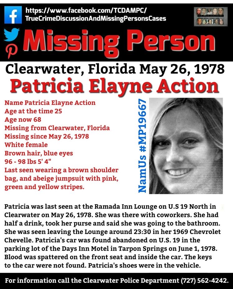 Yes Patty Action also in 1978. She left the Ramada Inn lounge with out saying bye to her friends. Her car, similarly to Barbara Barkley's, was found abandoned. Barbara's in Clearwater and Patty's in Tarpon Springs near Anderson Park. I know a lot about these women who are missing or their bodies were found. In 1982 it was my dad's female friend Phyllis Jean Senneker who was found murdered in her home in Cloarwater about a week after my friend Wendy Huggy went missing. It destroyed my father to know someone could have no empathy or compassion for her. Left her to die after stabbing her dozens of times. The difference is that they arrested an convicted Francis Husted for her murder and he admitted it saying he didn't realize it was so easy to kill someone. Tonight after 40 years of telling myself I would never do it I am questioning if Mr. Husted is just a liar and responsible for so many others or is he a liar that did not kill Phyllis and just wanted to go back to prison because he'd spent a good part of his life there and even voiced he was glad to be going back. Did someone else kill her I wonder and where there other victims of his like Barbara and Patty and Rose and Cynthia. The first time in 40 years I have doubt.