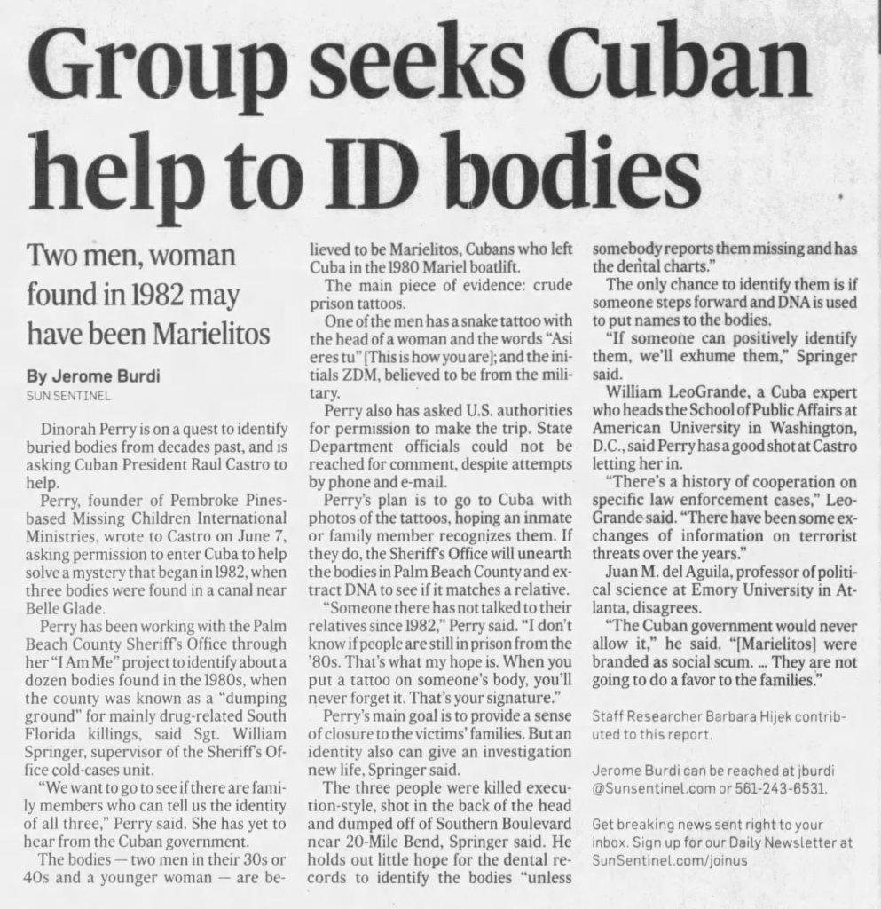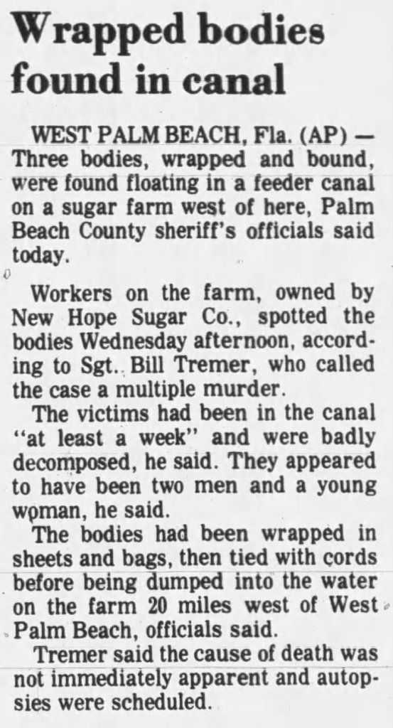 The victim's body was found with a female, 1220UFFL, and a male, 2506UMFL in C-51 Canal, eight miles west of U.S. 441 on New Hope Sugar property in Belle Glade.