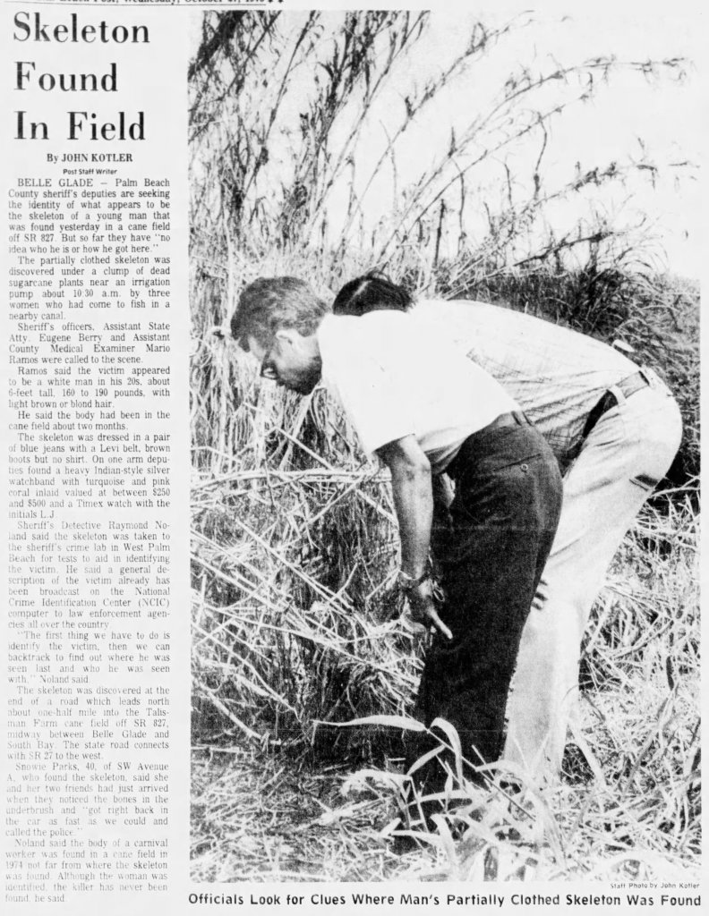 The picture in the PB Post shows 2 men looking ‘where’ the skeleton was found, and they are not looking at sugar cane. That’s maiden cane, and it’s not usually found in cane fields. It is more likely to be found on ditch banks, because they don’t get sprayed as much, as are pumps, of course.