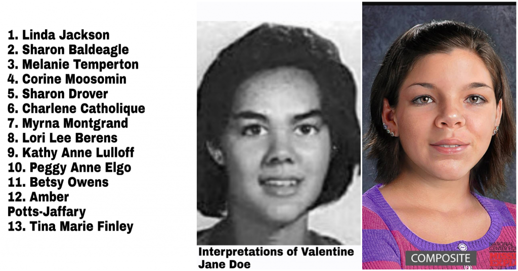 Okay, I think Charlene and Valentine have some eerie similarities. And Charlene was hitchhiking. In the photo, she even has noticably nice teeth, and if her moth was closed, it looks like her lips would match Val. She probably has the most similiar nose as of yet, which is whats so distinct about Doe.