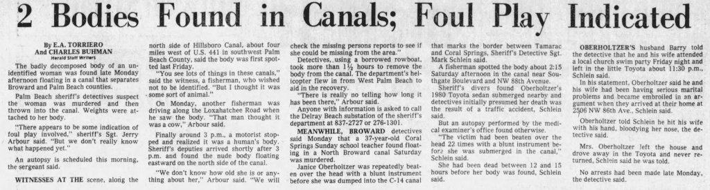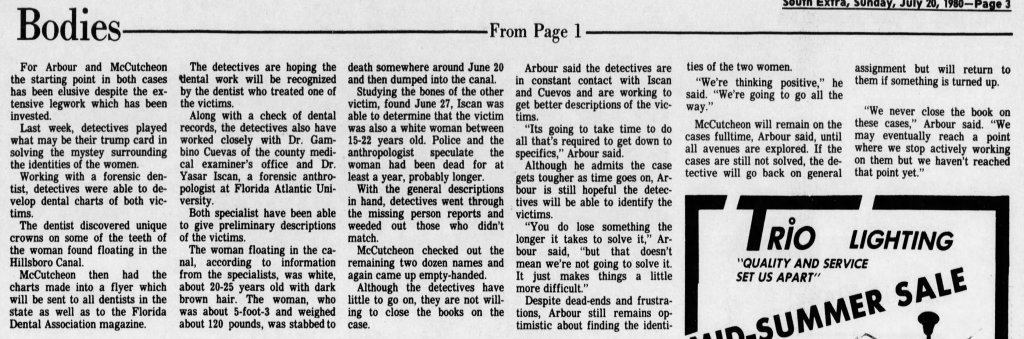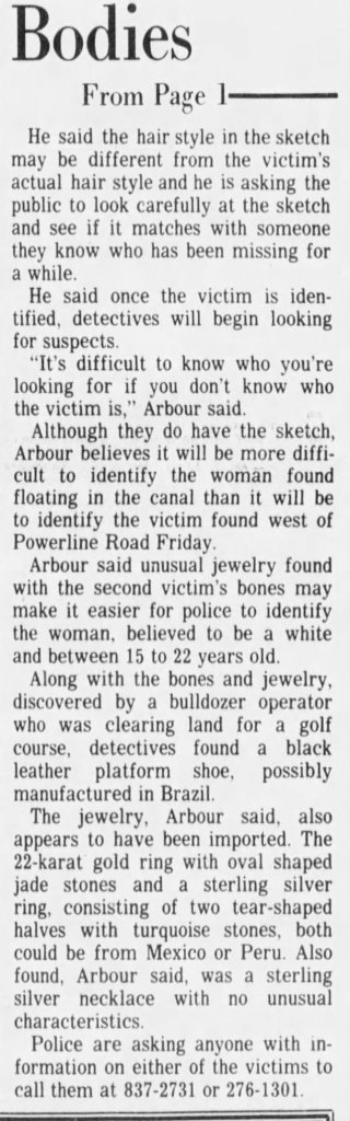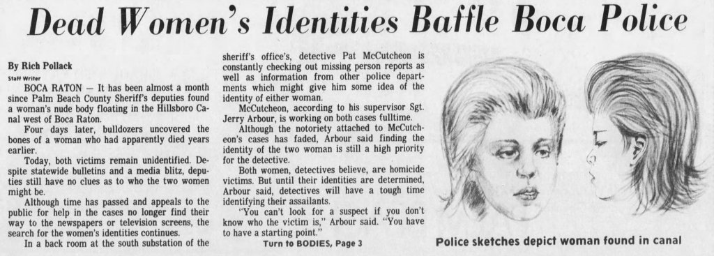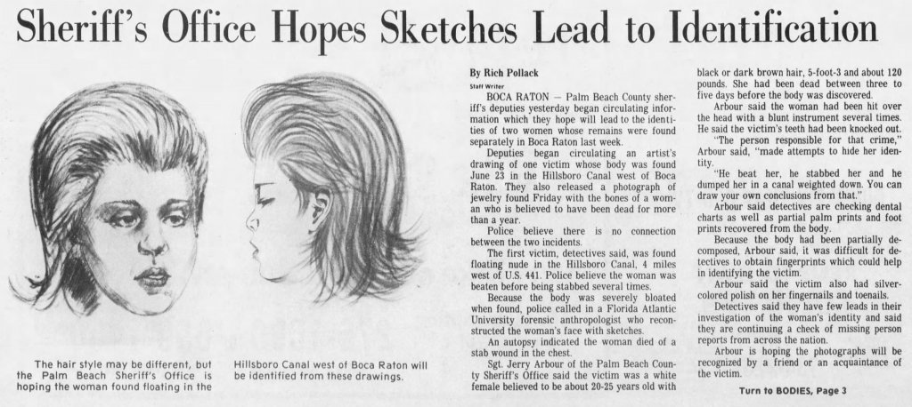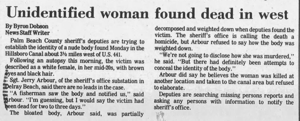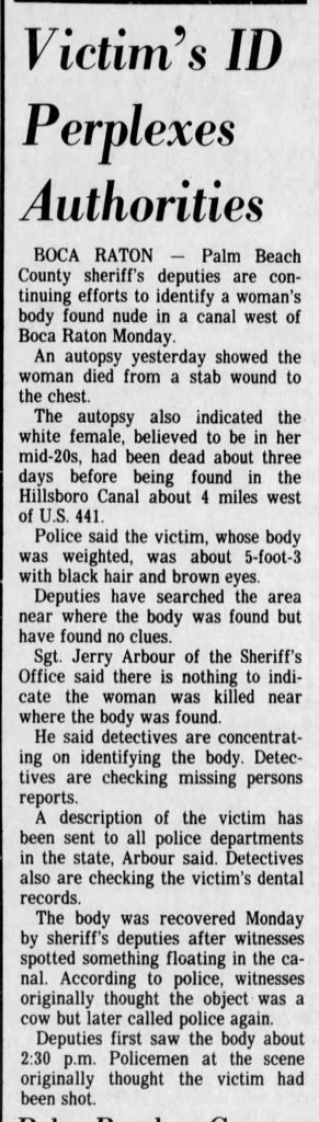 Deputies believe the woman is a victim of a homicide. Her body was found naked and stabbed in a canal west of State Route 411 on June 30, 1980, according to The Palm Beach Post's archives. Detectives said she was likely dumped in the canal 10 days before she was found.