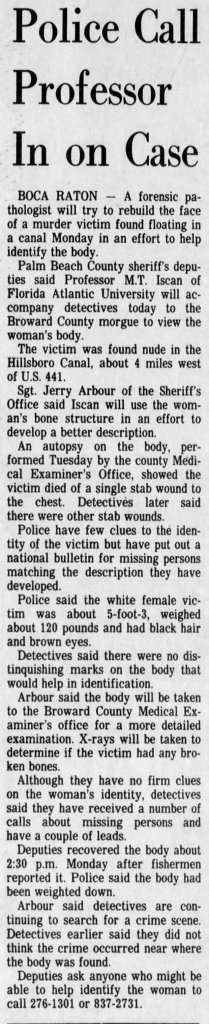 The woman was found naked and stabbed in the Hillsboro Canal in June 1980. She had a slight overbite and she may have been a mom. The rest is elusive.