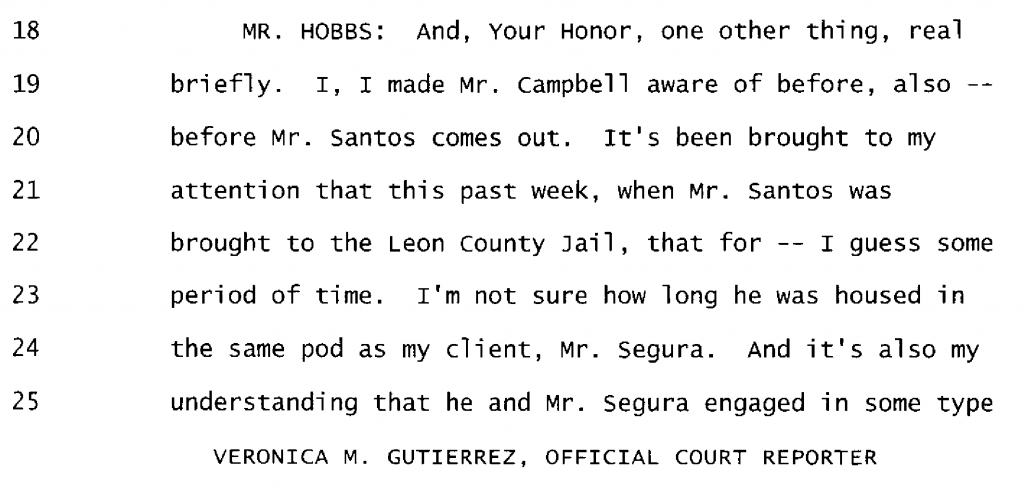 It was reported in the media way back when but I never took the time to find anything confirming it. It would be nice to see the complete transcript (it just suddenly stops). Mr. Hobbs said he was going to question Santos about this.. but no more pages. Regardless it would be just Santos lying as usual. Interesting though it is Segura's own defense bringing this to light so many years ago.Segura & Santos in same jail pod???!!!!