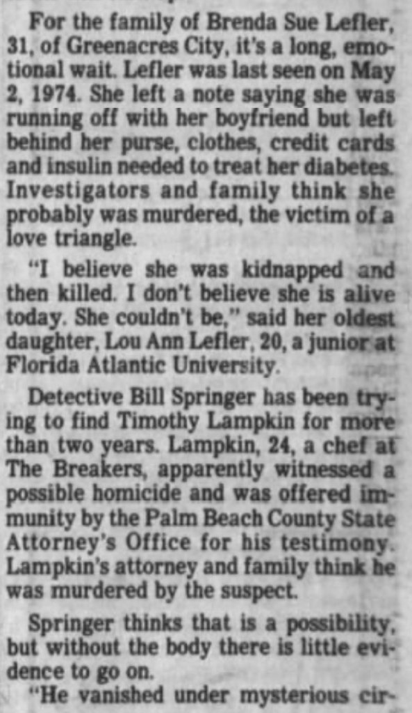 Brenda Sue Lefler was last seen in Greenacres, Florida on May 2, 1974
