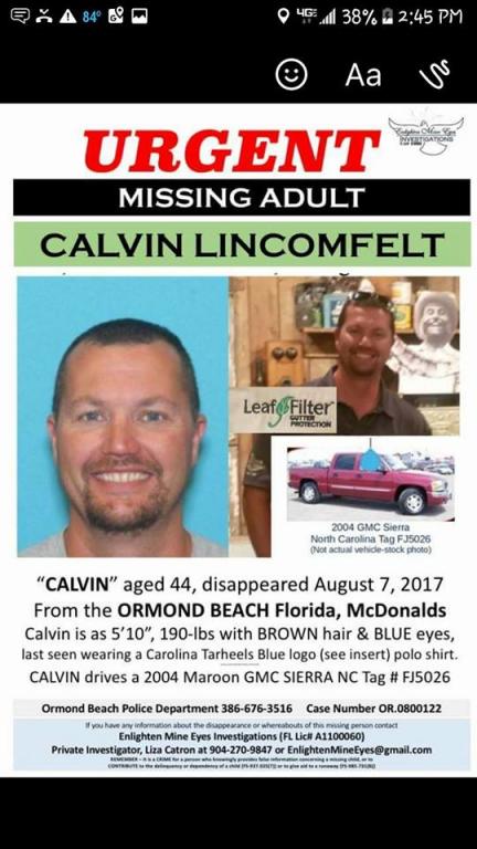 Lincomfelt was last seen wearing a light blue shirt and was driving a red 2004 GMC Sierra Crew Cab bearing North Carolina tag number FJ5026...
