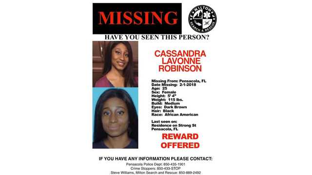 Cassandra Lavonne Robinson, 25, was last seen Feb. 1, according to a news release issued Tuesday by the Pensacola Police Department. Her address was 705 W. Strong St. in Pensacola.
