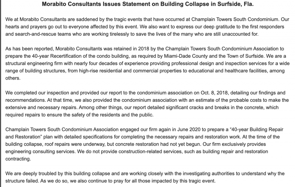 Morabito Consultants Issues Statement on Building Collapse in Surfside, Fla.