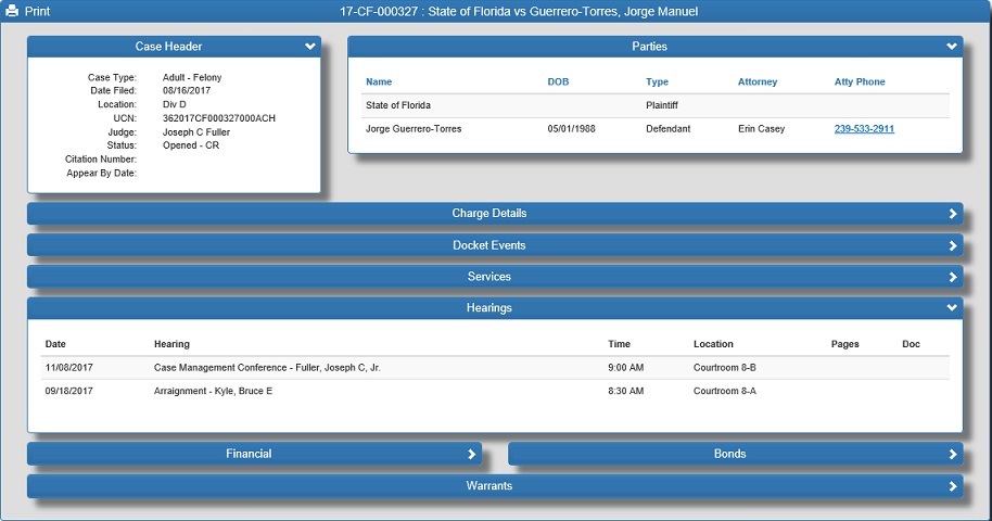 Docs and court events regarding the charges filed by the Lee County Sheriff's Office are available at: https://matrix.leeclerk.org