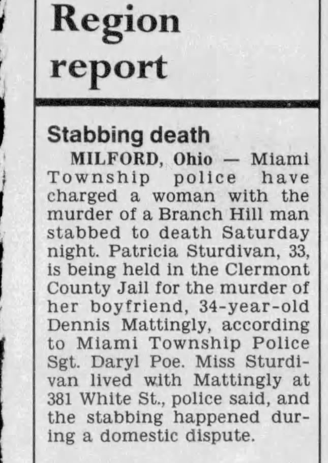 Dennis Mattingly lived all his life in Ohio as far as I can tell. While I’m on a roll I found a few more articles about him. *If * there is a connection to him it doesn’t bode well for her.