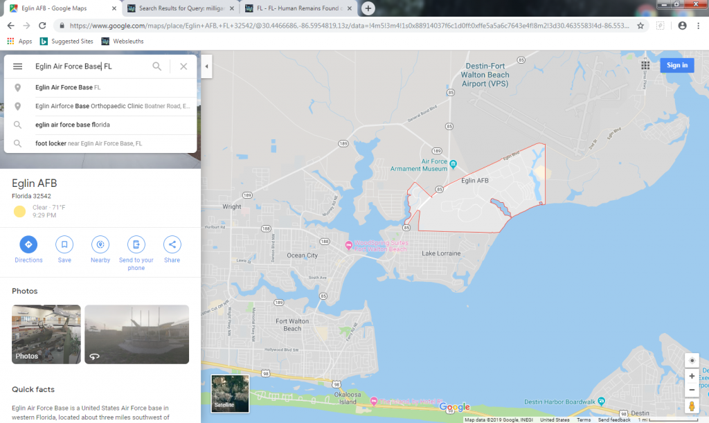 So the msm says Elgin AF reserve near county line and hwy 98. So this would, I think, be right around the Fort Walton/Destin area. the county line between Santa Rosa Co and Okaloosa Co is in between Santa Rosa Island and Navarre. Now, I am really bad at mapping, so don't trust me!