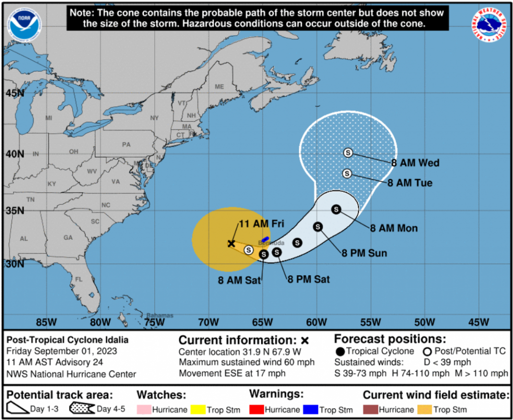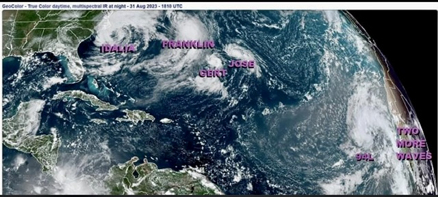 The kind of Tropical Atlantic satellite image one doesn't see every day. From left to right: Tropical Storm Idalia. Hurricane Franklin. Depression Gert. Tropical Storm Jose. Invest 94L (likely to develop). Two more waves one or both of which will likely be Invest tagged over the weekend or next week.