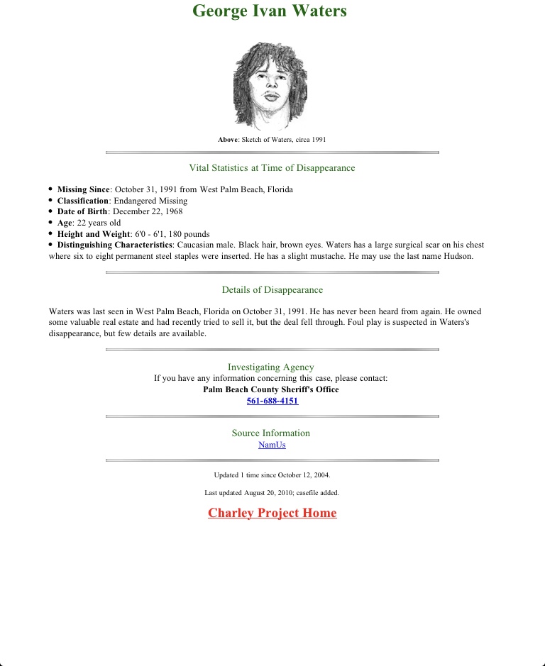 Circumstances of Disappearance: Waters was last seen in West Palm Beach, Florida on October 31, 1991. He has never been heard from again. He owned some valuable real estate and had recently tried to sell it, but the deal fell through. Foul play is suspected in his disappearance, but few details are available.