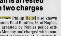 Interesting but inconclusive. The clipping from James arrest in the early 90s (referred above) clearly states that he (legally) changed his name from Helle to Hanifen not long before the arrest. I am at a loss to understand why that would be necessary when his birth name was Hanifen. I think this needs some more digging (could it be something to do with divorces and remarriages - I do not know)? There is no doubt that he was using the name Helle when at Naples High School as he appears in the yearbook under that name several times.