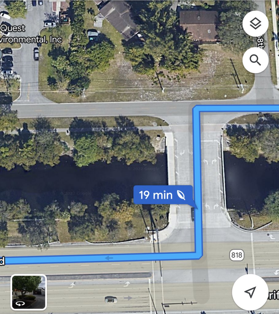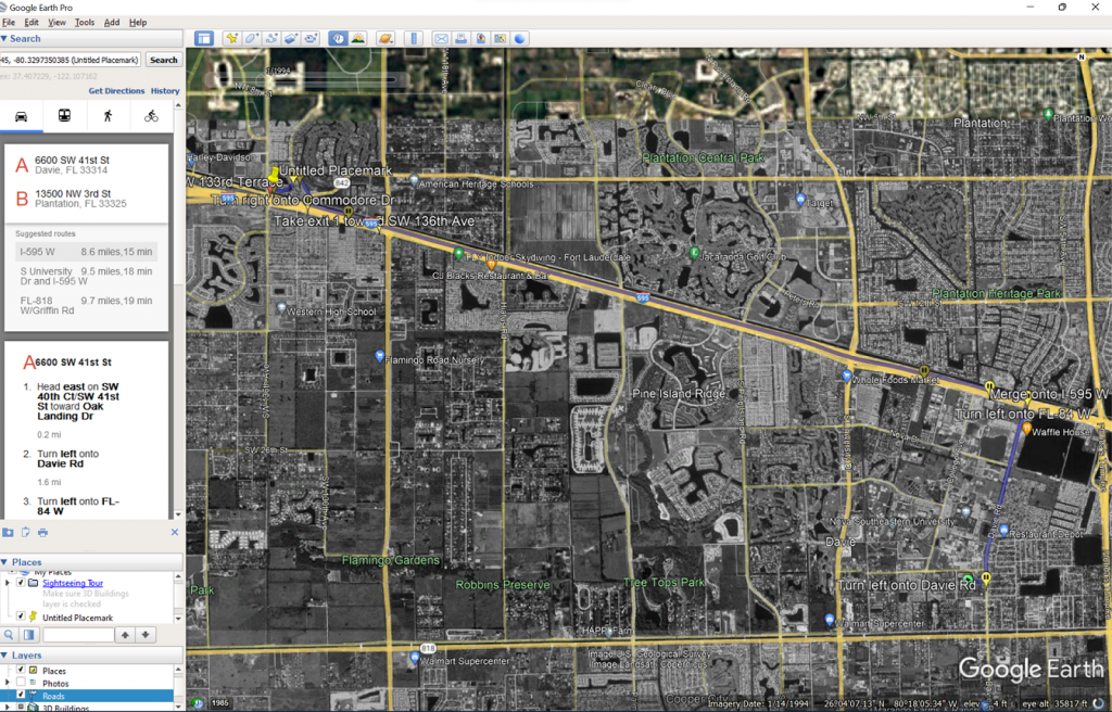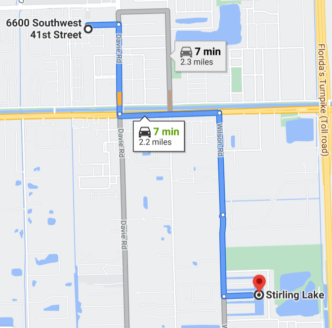 I was able to pull up Google Earth on the laptop and trace the route looking at the roads available in 1984 and 1995. If he took Davie Rd north to 84, there is a large pond on the east side of Davie just before 84. Additionally, it appears that there were no barriers where Davie T's into 84. If he was going to the subdivision on the west side of 136th and north of 84, there were two medium sized ponds, but the entire subdivision was leveled in the mid-90s.